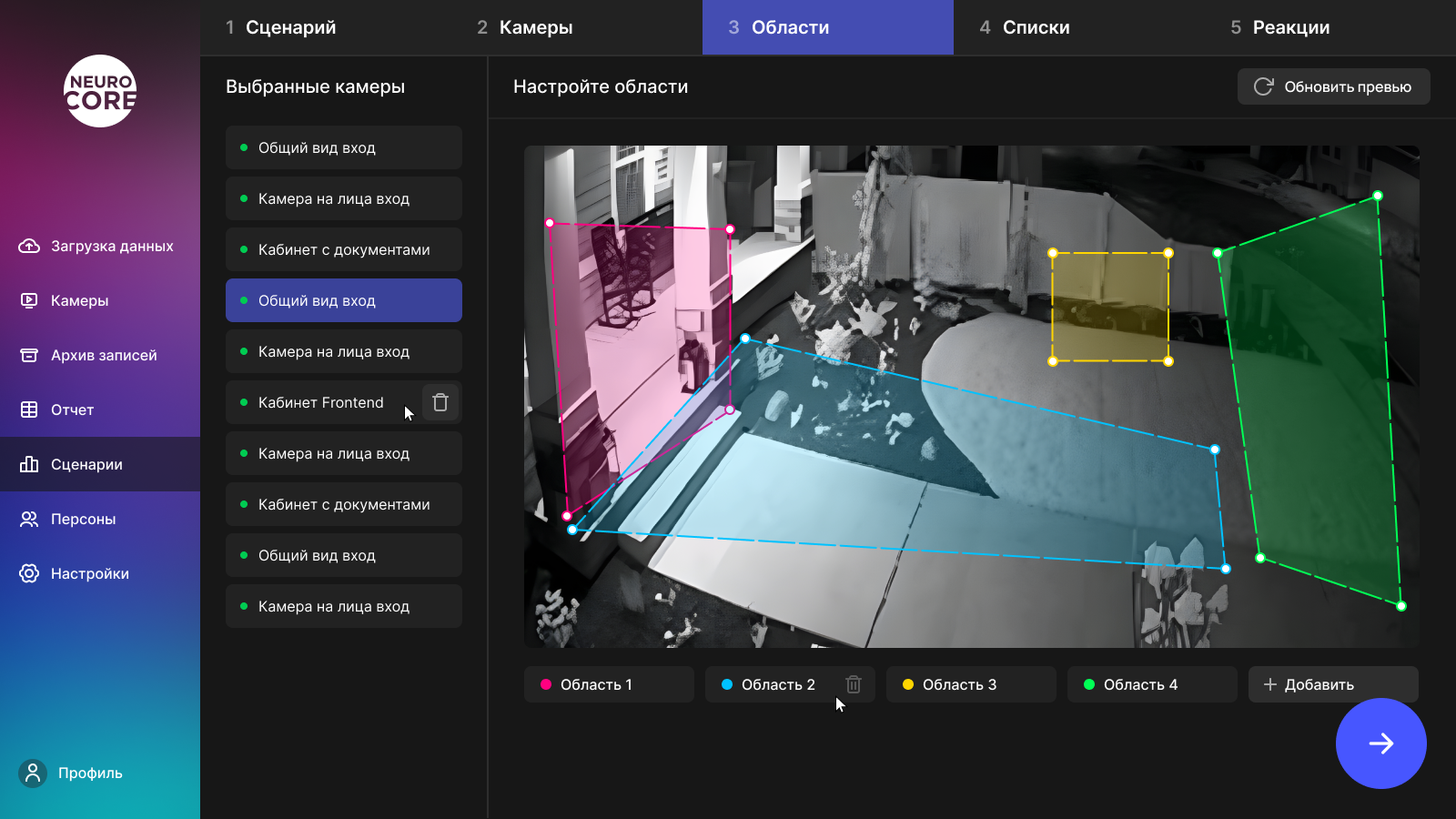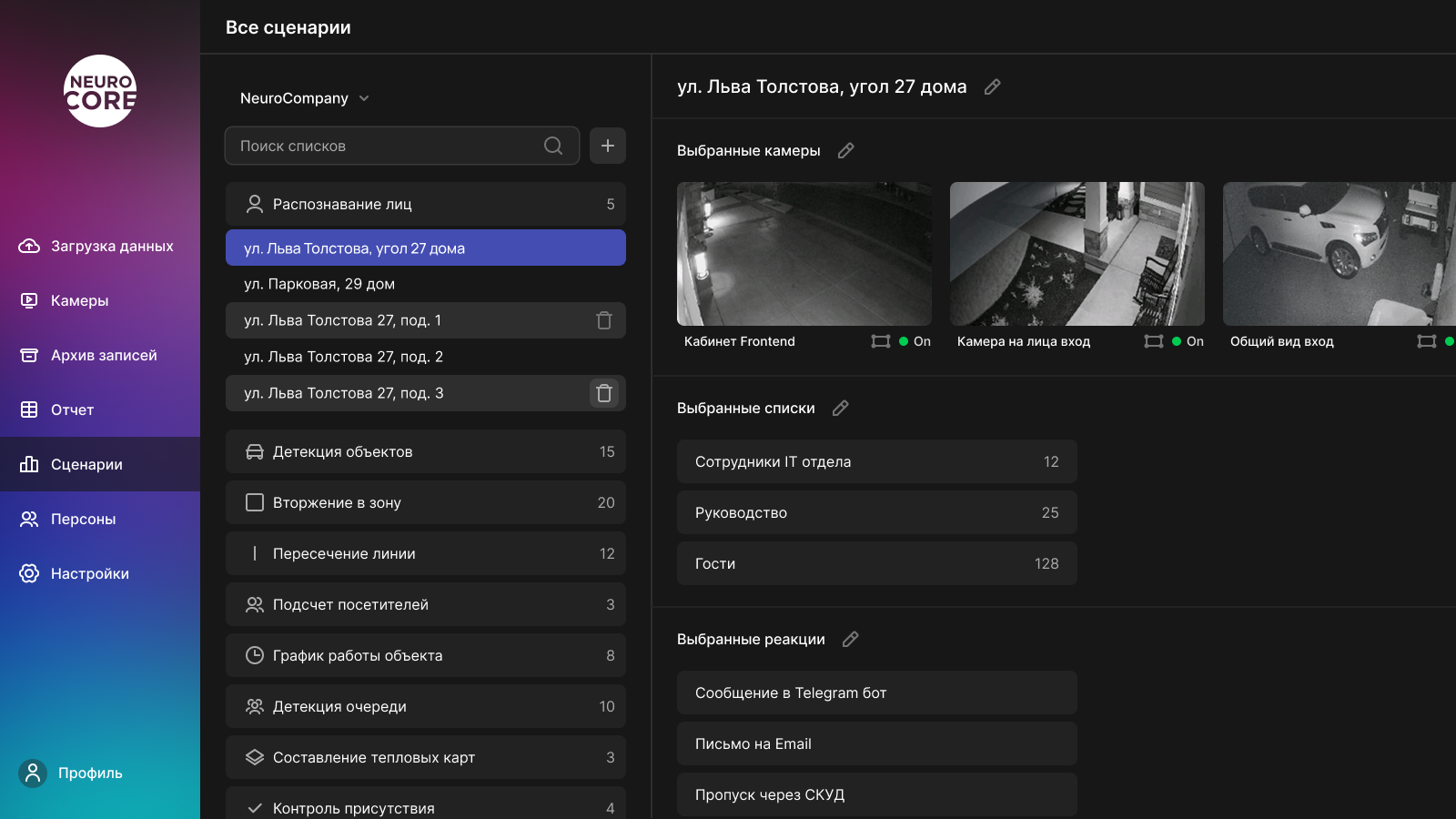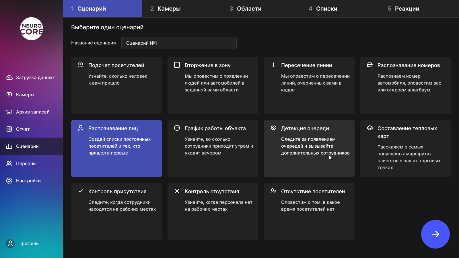 Первым делом, нужно определиться с типом будущего сценария. Представим, что нам нужно распознавать сотрудников на входе в офис для открытия турникета. Для этого отлично подойдет тип "Распознавание лиц". На следующем этапе появится список с доступными камерами. Когда пользователь выберет нужные ему камеры, для каждой можно настроить область распознавания. Осталось два этапа, подключение списка с фотографиями персон и выбор требуемой реакции системы. В нашем случае нужна реакция "Пропуск через СКУД".