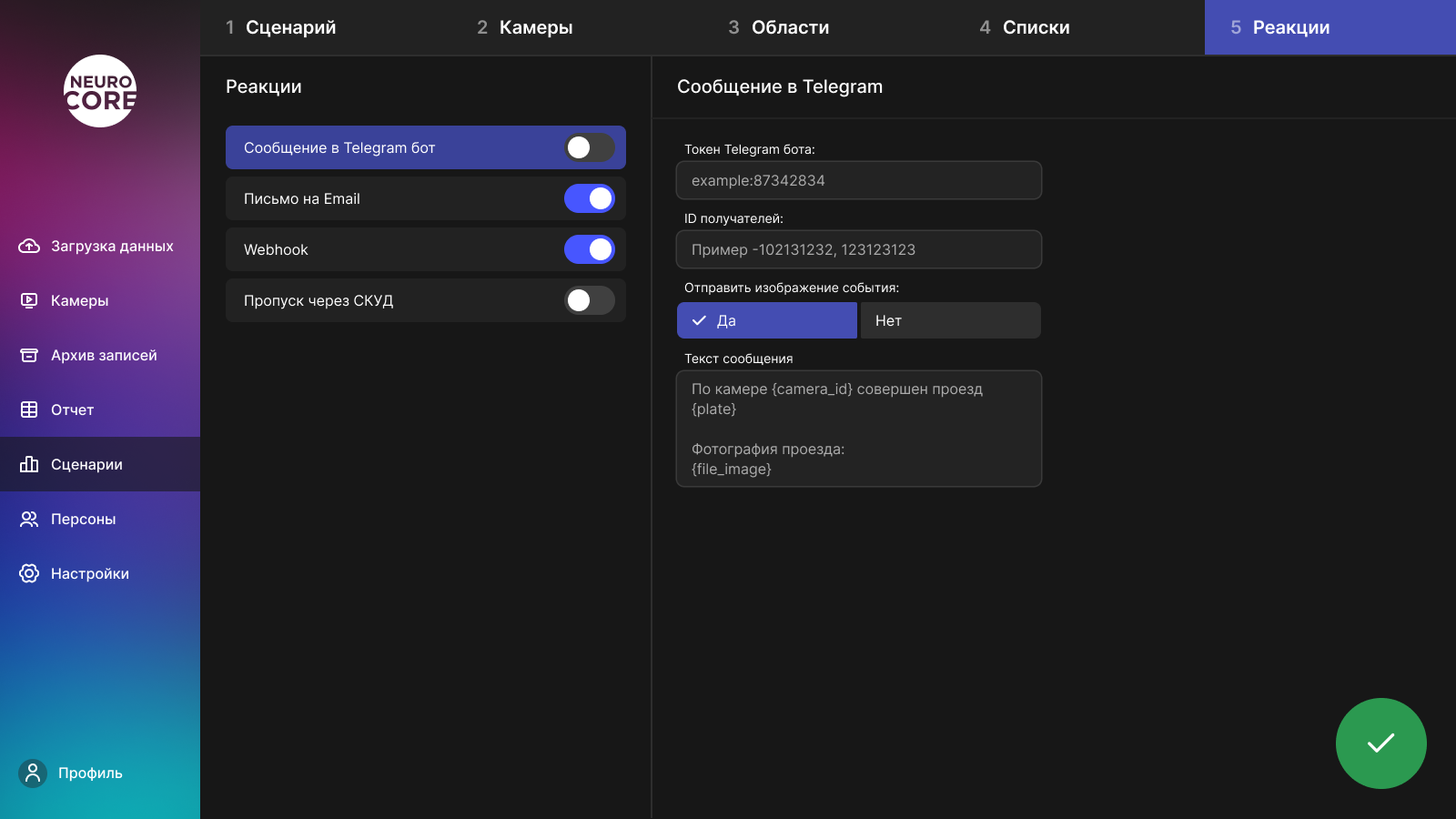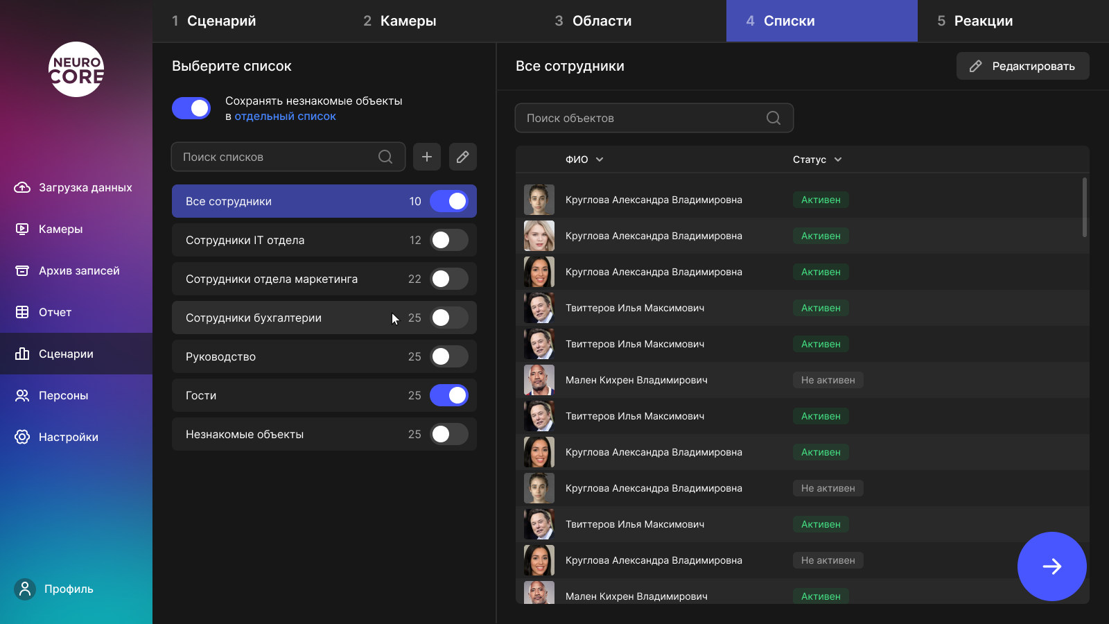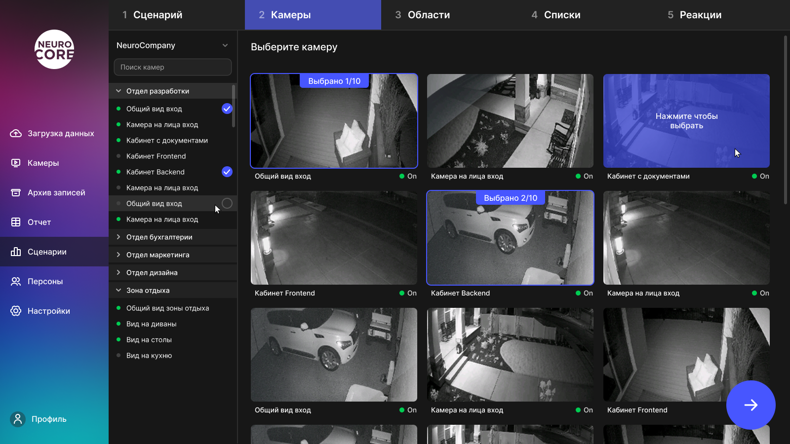Первым делом, нужно определиться с типом будущего сценария. Представим, что нам нужно распознавать сотрудников на входе в офис для открытия турникета. Для этого отлично подойдет тип "Распознавание лиц". На следующем этапе появится список с доступными камерами. Когда пользователь выберет нужные ему камеры, для каждой можно настроить область распознавания. Осталось два этапа, подключение списка с фотографиями персон и выбор требуемой реакции системы. В нашем случае нужна реакция "Пропуск через СКУД".