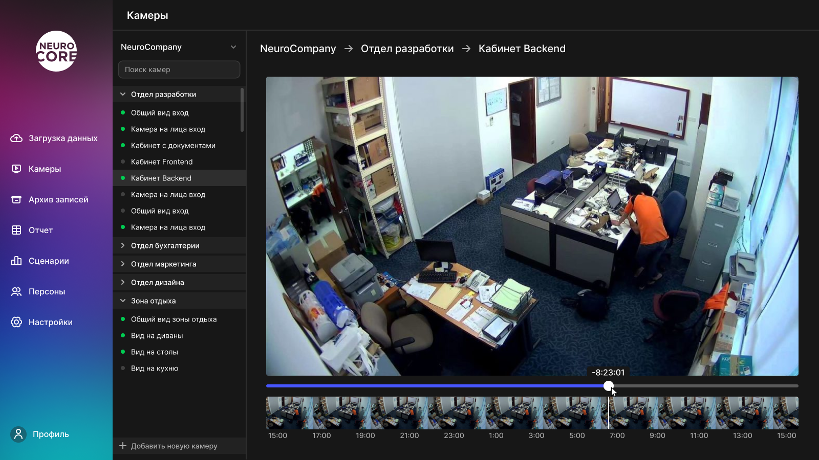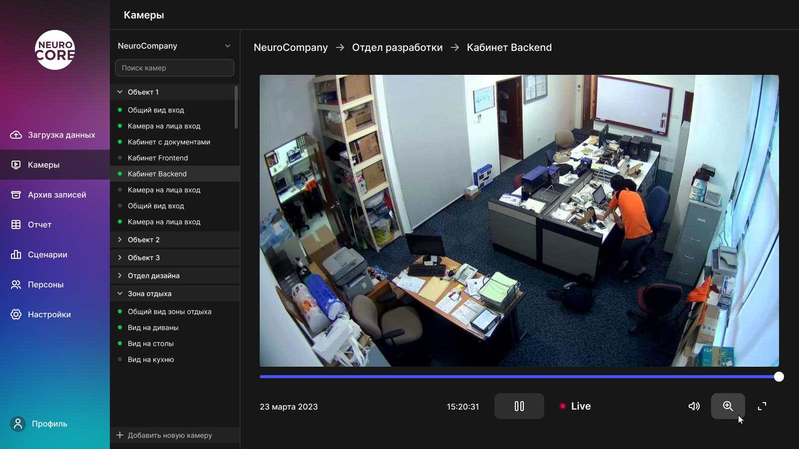 На экране "Камеры" расположен список со всеми камерами в организации. Расположены они в иерархическом порядке для удобства навигации. С правой части экрана можно посмотреть изображение с камеры, а также перемотать на нужный период времени чтобы посмотреть проверить инцидент.