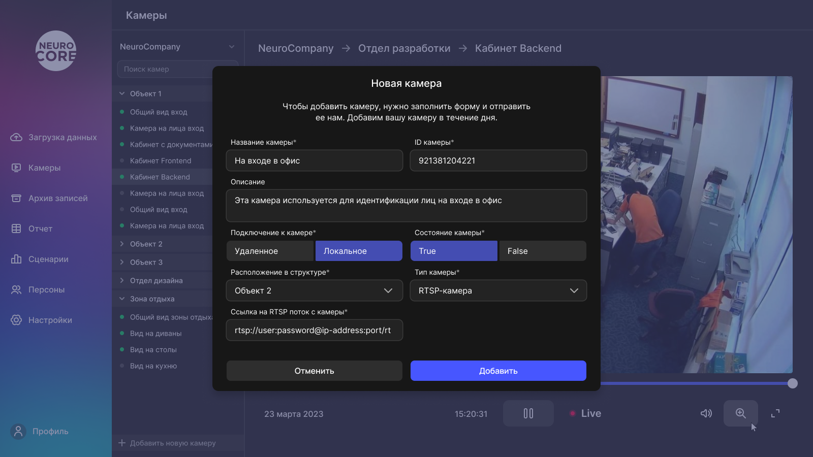 На данный момент в архитектуре платформы не заложено добавление камеры руками пользователя. Поэтому пользователь вводит данные камеры в модальном окне, а сотрудник платформы с другой стороны добавляет эти камеры вручную.